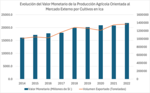 Según su valor agregado bruto, en 2021, las principales actividades económicas en Ica incluyeron la manufactura (19%), seguida por la extracción de petróleo, gas y minerales (18.5%), agricultura, ganadería, caza y silvicultura (14%), construcción (11.6%) y el comercio (8.5%) (BCRP, 2022). A partir del 2010, Ica experimentó un boom agroexportador como se observa en el gráfico 1. Los principales cultivos de Villacurí son el espárrago, la uva, la palta, la alcachofa, cebolla, paprika, algodón, entre otros (INEI, 2022a). Algunos factores que facilitaron el boom han sido el TLC firmado con los EE.UU. y la UE, y características geográficas de Ica al ser una zona árida con un clima estable todo el año. Ya que las lluvias escasas e irregulares pueden dificultar la producción, el Perú ha lanzado diferentes proyectos de infraestructura hidráulica en los últimos años para paliar ese problema.