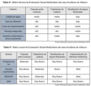 Se utiliza la teoría de flujos y fondos para comprender el funcionamiento del sistema hídrico que representa los acuíferos referidos. Luego, para comprender la competencia entre los diversos usos de los flujos de agua se realiza un análisis multiescalar (Multi-Scale Integrated Analysis of Societal and Ecosystem Metabolism o MuSIASEM) que muestra qué actividades utilizan más del recurso, según su intensidad. Para ello, se han utilizado datos del informe final de evaluación de la veda de los acuíferos Villacurí y Lanchas del ANA, así como el informe de Caracterización del departamento de Ica del BCRP. Se concluye con la elaboración y evaluación de propuestas de solución del problema mediante una matriz de evaluación social multicriterio, que reúne distintos puntos de vista y niveles a los que los actores pueden interactuar y encontrar acuerdos mutuos entre sus objetivos.