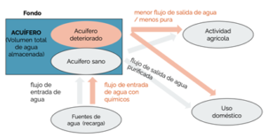 El gráfico 4 aplica dicha teoría al caso de estudio. Según la teoría citada, los acuíferos de Ica-Villacurí y su volumen total de agua almacenada son los fondos, y las entradas y salidas de agua en este sistema serían los flujos. Según la segunda ley de la termodinámica, el flujo de agua que sale del sistema tiene mayor entropía, es decir, es menos utilizable, que el flujo que ingresó. La actual explotación para la exportación agrícola ha causado un considerable agotamiento del acuífero, el cual, al deteriorarse, reduce su capacidad de producir flujos sosteniblemente y de calidad. Debido a este cambio, como se ve en el gráfico, el fondo pasa a ser un acuífero deteriorado cuyos flujos de entrada son el agua con químicos y sus flujos de salida son agua menos pura y/o salinizada. De esta manera, se observa que el acuífero ve reducida su capacidad de purificar y proveer agua para las generaciones futuras.