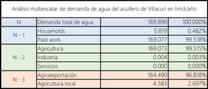 Desde este enfoque (ver tabla 2), se puede evaluar la distribución de agua del acuífero mediante la demanda de agua. En un primer nivel, se concentra la demanda total de agua. En el año 2018 fue de 169,9 hm3, por lo que, siendo su recarga anual estimada en 91.71 hm3, existe una sobreexplotación de 78.186 hm3 /año. En un segundo nivel, esta demanda hídrica se distribuye entre los hogares y el trabajo pagado. Según la división de explotación por tipo de uso, los hogares consumen 0.819 hm3/año, un 0.482% del total. Este cálculo incluye el consumo de agua poblacional y doméstico. En el mismo nivel se encuentra el trabajo pagado, el cual consume el mayor porcentaje de agua, siendo este de 169.077 hm3/año representando un 99.518%.